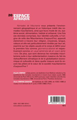 Nomades de Mauritanie vise à comprendre l'identité culturelle des nomades mauritaniens à travers leur environnement géographique, histoire, mode de vie, système social, alimentation, habitat et artisanat et comment elle est révélée par leur art exprimé, sur les objets usuels et le corps et défini pour la première fois comme géometrico-abstrait et respectivement comme art usuel éphémère et art vivant éphémère. De plus, que sont devenus les nomades de Mauritanie et dans quelle mesure sont-ils encore les piliers et le coeur de la société mauritanienne d'aujourd'hui ?