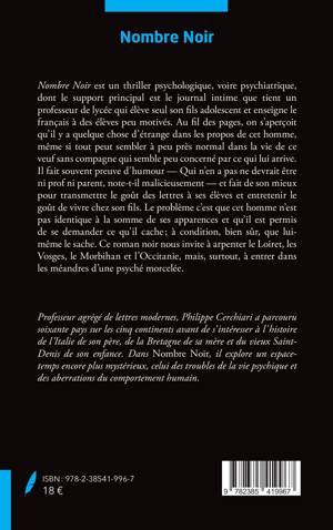 Nombre Noir est un thriller psychologique, voire psychiatrique, dont le support principal est le journal intime que tient un professeur de lycée qui élève seul son fils adolescent et enseigne le français à des élèves peu motivés. Au fil des pages, on s’aperçoit qu’il y a quelque chose d’étrange dans les propos de cet homme, même si tout peut sembler à peu près normal dans la vie de ce veuf sans compagne qui semble peu concerné par ce qui lui arrive. Il fait souvent preuve d’humour — Qui n’en a pas ne devrait être ni prof ni parent, note-t-il malicieusement — et fait de son mieux pour transmettre le goût des lettres à ses élèves et entretenir le goût de vivre chez son fils. Le problème c’est que cet homme n’est pas identique à la somme de ses apparences et qu’il est permis de se demander ce qu’il cache ; à condition, bien sûr, que lui-même le sache. Ce roman noir nous invite à arpenter le Loiret, les Vosges, le Morbihan et l’Occitanie, mais, surtout, à entrer dans les méandres d’une psyché morcelée.