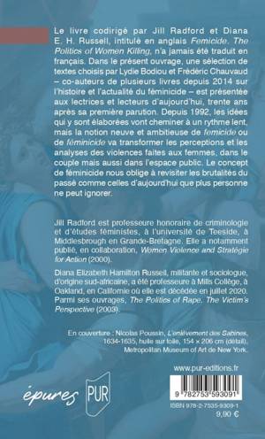 Le livre codirigé par Jill Radford et Diana E. H. Russell, intitulé en anglais Femicide. The Politics of Women Killing, n’a jamais été traduit en français. Dans le présent ouvrage, une sélection de textes choisis par Lydie Bodiou et Frédéric Chauvaud – co-auteurs de plusieurs livres depuis 2014 sur l’histoire et l’actualité du féminicide – est présentée aux lectrices et lecteurs d’aujourd’hui, trente ans après sa première parution. Depuis 1992, les idées qui y sont élaborées vont cheminer à un rythme lent, mais la notion neuve et ambitieuse de femicide ou de féminicide va transformer les perceptions et les analyses des violences faites aux femmes, dans le couple mais aussi dans l’espace public. Le concept de féminicide nous oblige à revisiter les brutalités du passé comme celles d’aujourd’hui que plus personne ne peut ignorer.