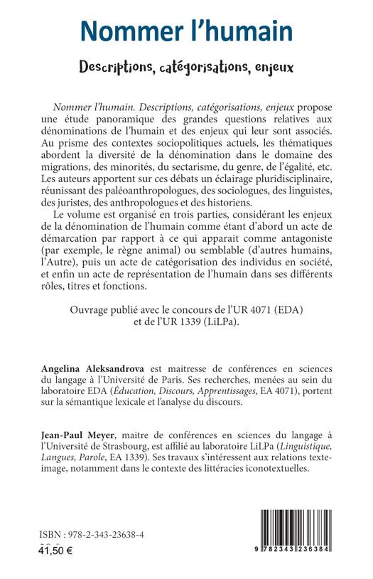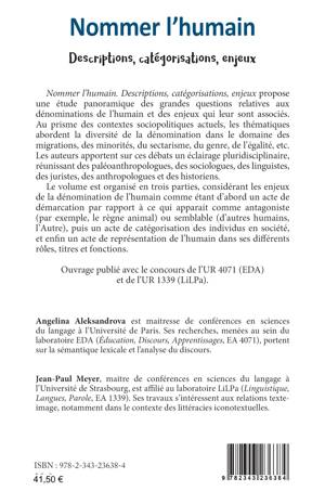 Ce livre propose une étude panoramique des grandes questions relatives aux dénominations de l'humain et des enjeux qui leur sont associés. Au prisme des contextes sociopolitiques actuels, les thématiques abordent la diversité de la dénomination dans le domaine des migrations, des minorités, du sectarisme, du genre, de l'égalité etc. Le volume est organisé en trois parties, considérant les enjeux de la dénomination de l'humain comme étant d'abord un acte de démarcation par rappport à ce qui apparait comme antagoniste (par exemple, le règne animal) ou semblable (d'autres humaines, l'Autre), puis un acte de catégorisation des individus en société, et enfin un acte de représentation de l'humain dans ses différents rôles, titres et fonctions.