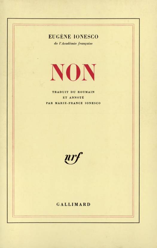 Non, ouvrage de critique, a été écrit en roumain, entre 1930 et 1933, lorsque Ionesco avait vingt ans. Dans une première partie, Ionesco attaque violemment trois gloires reconnues de la littérature roumaine : le poète Tudor Arghezi, le poète Ion Barbu et le romancier Camil Petresco. En fait, plus qu'à eux, il s'en prend aux critiques qui les ont encensés. Ces essais critiques sont entrecoupés de passages où l'on reconnaît les grands thèmes de Ionesco : dans une sorte de journal, des réflexions sur la vanité du métier de critique et surtout sur la peur de la mort, leitmotiv le plus essentiel de toute l'oeuvre de Ionesco : "Je vais mou-ou-ou-ou·ou-ou-rir." La seconde partie est une suite d'essais sur la critique. Ionesco essaie d'y démontrer la vanité de la critique, et même son impossibilité. Et aussi l'impossibilité et l'absurdité de l'art. Il s'amuse, par exemple, à écrire un éloge dithyrambique puis un éreintement de La Nuit bengali de Mircea Eliade. Il retrace de façon caricaturale la carrière type d'un écrivain en Roumanie. Il avance des paradoxes sur le roman, et sur le génie littéraire. Dès qu'on s'exprime, on cesse d'être soi-même. La valeur esthétique n'existe pas. "Si Dieu existe, à quoi bon faire de la littérature ? Si Dieu n'existe pas, alors, à quoi bon faire de la littérature ?" Dans la Roumanie d'alors, le jeune Ionesco était ce qu'on appelait "négativiste". Le lecteur français y reconnaîtra ce regard clownesque et angoissé à la fois devant l'évidence de l'absurde, qui est au coeur même de son théâtre.