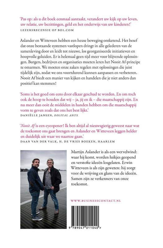 Nooit Af is een boek zoals je ze niet vaak tegenkomt: het schetst een caleidoscopisch beeld van alle ontwikkelingen in onze maatschappij – zowel op persoonlijk vlak als voor bestuurders van organisaties en van ons land – én het biedt een manier van kijken en handelen die je niet anders dan positief kan stemmen! Aslander en Witteveen hebben een heuse beweging ontketend. Het besef dat onze bestaande systemen vastlopen dringt in alle gelederen van de samenleving door en leidt tot nieuwe, los georganiseerde initiatieven en hoopvolle geluiden. In een wereld die Nooit Af is, nemen mensen die gewoon beginnen het voortouw.