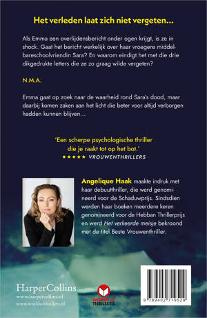 Nooit meer alleen is de psychologische bestseller van thrillerschrijver Angelique Haak. Als Emma een overlijdensbericht onder ogen krijgt, is ze in shock. Gaat het bericht werkelijk over haar vroegere middelbareschoolvriendin Sara? En waarom eindigt het met die drie dikgedrukte letters die ze zo graag wilde vergeten? N.M.A. Emma gaat op zoek naar de waarheid rond Sara's dood, maar daarbij komen zaken aan het licht die beter voor altijd verborgen hadden kunnen blijven… 'Een scherpe psychologische thriller die je raakt tot op het bot.' Vrouwenthrillers *****