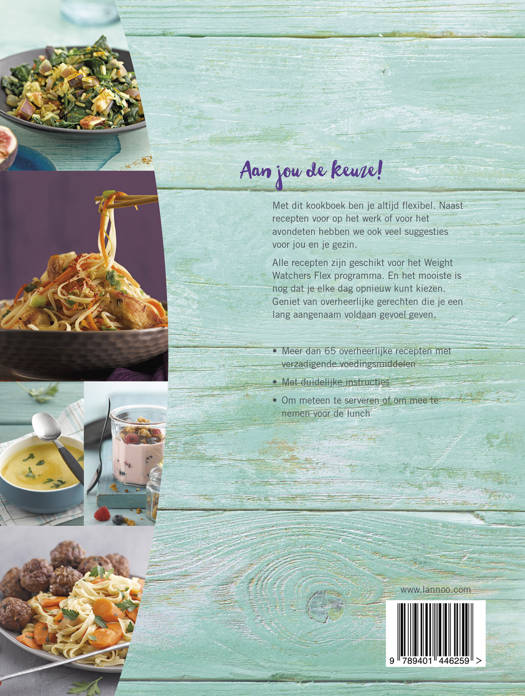 Met dit kookboek ben je altijd flexibel. Naast recepten voor op het werk of voor het avondeten hebben we ook veel suggesties voor jou en je gezin. Alle recepten zijn geschikt voor het Weight Watchers Flex programma. En het mooiste is nog dat je elke dag opnieuw kunt kiezen. Geniet van overheerlijke gerechten die je een lang aangenaam voldaan gevoel geven.