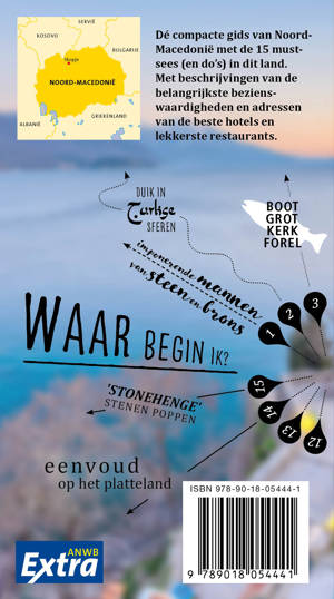 Beleef Noord-Macedonië met de compleet vernieuwde reisgids ANWB Extra Noord-Macedonië! Noord- Macedonië wordt door zijn vele prachtige bergen en groene weides ook wel het Zwitserland van de Balkan genoemd. Hierdoor is Noord-Macedonië de perfecte bestemming voor een leuke vakantie.De compacte ANWB Extra reisgids Noord-Macedonië biedt naast diverse routes door het land en veel praktische tips over hotels en vervoer ook 15 inspirerende bezienswaardigheden die je tijdens je vakantie niet mag missen. Bezoek de warmwaterbron en waterval ten oosten van Strumica, ga eindeloos wandelen in Nationaal Park Pelister, of dobber een middagje op het water rond de Matkakloof.Deze compacte reisgids past gemakkelijk in de tas en heeft een handige uitneembare kaart met daarop de beste tips voor winkelen, eten en drinken en uitgaan.ANWB Extra is de succesvolste reisgidsenserie van Nederland! Met al meer dan 5 miljoen compacte gidsen verkocht, biedt deze serie een reisgids voor nagenoeg iedere denkbare bestemming.