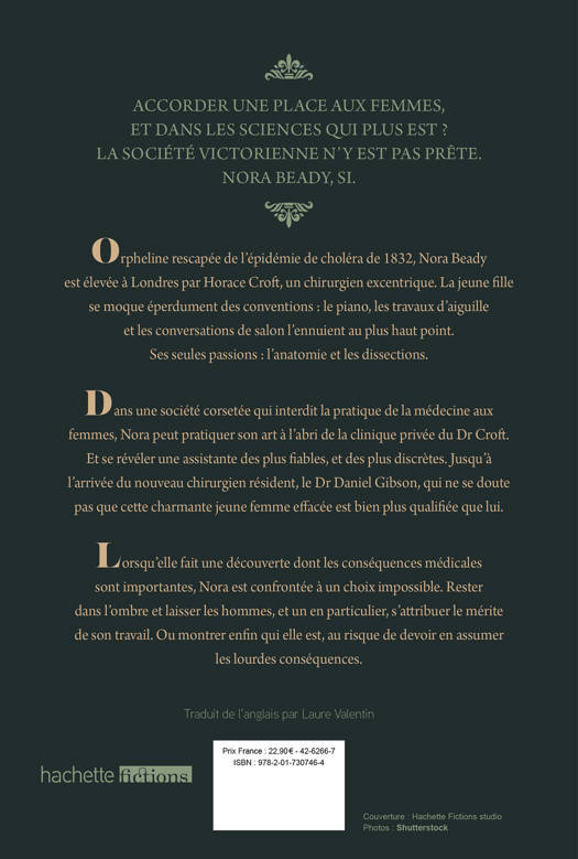 Après la mort de ses parents dans l’épidémie de choléra de 1832, Nora Beady est élevée à Londres par Horace Croft, un chirurgien excentrique. La jeune fille se moque éperdument des conventions : elle n'a de patience ni pour le piano, ni pour les travaux d'aiguille ou pour les conversations de salon. Ce sont l’anatomie et les dissections qui la passionnent. Au XIXe siècle, la pratique de la médecine est interdite aux femmes, mais, dans la clinique privée du Dr Croft, Nora est une assistante des plus fiable - et des plus secrète. Jusqu'à l'arrivée du nouveau chirurgien résident, le Dr Daniel Gibson qui ne se doute pas que Nora est plus qualifiée que lui. Lorsqu'elle fait une découverte dont les conséquences médicales sont importantes, elle est confrontée à un choix impossible. Rester dans l’ombre et laisser les hommes s'attribuer le mérite de son travail, ou montrer enfin ce qu'elle est et risquer de devoir en assumer les conséquences.