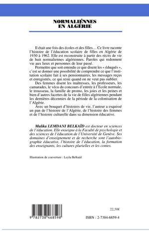 Il était une fois des écoles et des filles...Ce livre raconte l’histoire de l’éducation scolaire de filles en Algérie de 1930 à 1962. Elle est reconstruite à partir de récits de vie de huit normaliennes algériennes. Paroles qui redonnent vie aux lieux et personnes de leur passé. Permettre que soit entendu ce que disent les éduqués, c’est se donner une possibilité de comprendre ce que l’institution scolaire fait à ses pensionnaires, les messages reçus et enregistrés, ce qui reste quand on ne veut pas oublier.
