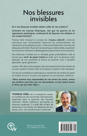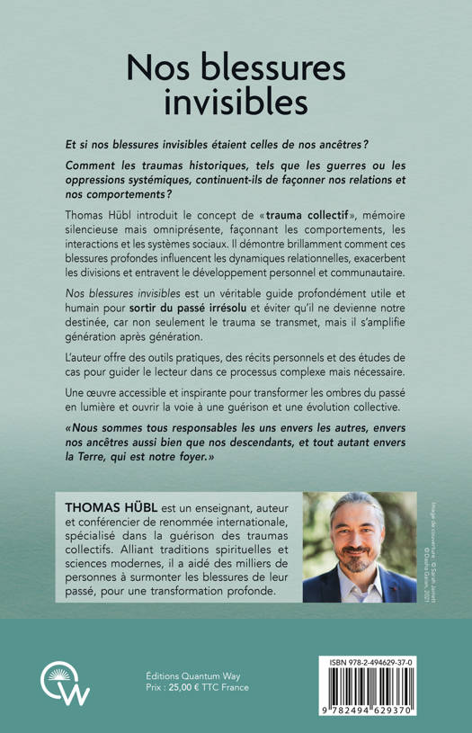 Et si nos blessures invisibles étaient celles de nos ancêtres ? Comment les traumas historiques, tels que les guerres ou les oppressions systémiques, continuent-ils de façonner nos relations et nos comportements ? Thomas Hübl introduit le concept de « trauma collectif », mémoire silencieuse mais omniprésente, façonnant les comportements, les interactions et les systèmes sociaux. Il démontre brillamment comment ces blessures profondes influencent les dynamiques relationnelles, exacerbent les divisions et entravent le développement personnel et communautaire. Nos blessures invisibles est un véritable guide profondément utile et humain pour sortir du passé irrésolu et éviter qu’il ne devienne notre destinée, car non seulement le trauma se transmet, mais il s’amplifie génération après génération. L’auteur offre des outils pratiques, des récits personnels et des études de cas pour guider le lecteur dans ce processus complexe mais nécessaire. Un livre profond et accessible pour transformer les ombres du passé en lumière, et proposer une opportunité de guérison et de croissance partagée. « Nous sommes tous responsables les uns envers les autres, envers nos ancêtres aussi bien que nos descendants, et tout autant envers la Terre, qui est notre foyer. »