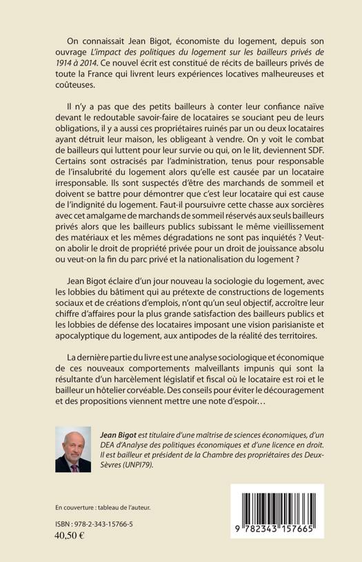 Cet ouvrage est constitué de récits de bailleurs privés de toute la France qui livrent leurs expériences locatives malheureuses et coûteuses. Ils peuvent être des propriétaires ruinés par leur locataire ayant détruit leur bien, les obligeant à vendre, ou qui deviennent SDF. Certains sont ostracisés par l'administration, tenus pour responsables d'une insalubrité causée par un locataire irresponsable. Ils sont suspectés d'être des marchands de sommeil. Face à ces accusations et aux lobbies du bâtiment qui n'ont que le profit pour ambition, Jean Bigot éclaire la sociologie du logement sous un nouveau jour.