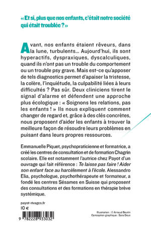 Avant, nos enfants étaient rêveurs, dans la lune, turbulents... Aujourd'hui, ils sont hyperactifs, dyspraxiques, dyscalculiques, quand ils n'ont pas un trouble du comportement ou un trouble psy grave. Mais est-ce qu'apposer de tels diagnostics permet d'apaiser la tristesse, la colère, l'inquiétude, la culpabilité liées à leurs difficultés ? Pas sûr. Deux cliniciens tirent le signal d'alarme et défendent une approche plus écologique : « Soignons les relations, pas les enfants ! » Ils nous expliquent comment changer de regard et, grâce à des clés concrètes, nous proposent d'aider les enfants à trouver la meilleure façon de résoudre leurs problèmes en puisant dans leurs propres ressources.