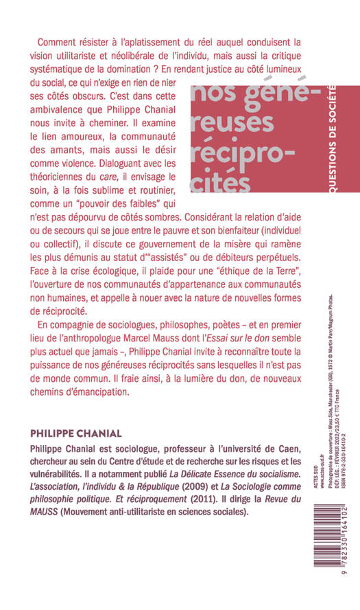 Comment résister à l'aplatissement du réel auquel conduisent la vision utilitariste et néolibérale de l'individu, mais aussi la critique systématique de la domination ? En rendant justice au côté lumineux du social, ce qui n'exige en rien de nier ses côtés obscurs. C'est dans cette ambivalence que Philippe Chanial nous invite à cheminer. Il examine le lien amoureux, la communauté des amants, mais aussi le désir comme violence. Dialoguant avec les théoriciennes du care, il envisage le soin, à la fois sublime et routinier, comme un "pouvoir des faibles" qui n'est pas dépourvu d'aspects sombres. Considérant la relation d'aide ou de secours qui se joue entre le pauvre et son bienfaiteur (individuel ou collectif), il discute ce gouvernement de la misère qui ramène les plus démunis au statut d'"assistés" ou de débiteurs perpétuels. Face à la crise écologique, il plaide pour une "éthique de la Terre", l'ouverture de nos communautés d'appartenance aux communautés non humaines, et appelle à nouer avec la nature de nouvelles formes de réciprocité. En compagnie de sociologues, philosophes, poètes - et en premier lieu de l'anthropologue Marcel Mauss dont l'Essai sur le don semble plus actuel que jamais -, Philippe Chanial invite à reconnaître toute la puissance de nos généreuses réciprocités sans lesquelles il n'est pas de monde commun. Il fraie ainsi, à la lumière du don, de nouveaux chemins d'émancipation.