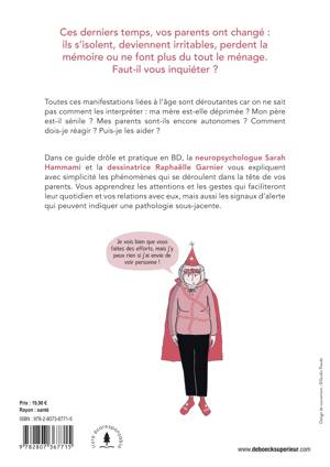 Dans ce guide drôle et pratique en BD, la neuropsychologue Sarah Hammami et la dessinatrice Raphaëlle Garnier vous expliquent avec simplicité les phénomènes qui se déroulent dans la tête de vos parents. Vous apprendrez les attentions et les gestes qui faciliteront leur quotidien et vos relations avec eux, mais aussi les signaux d’alerte qui peuvent indiquer une pathologie sous-jacente.