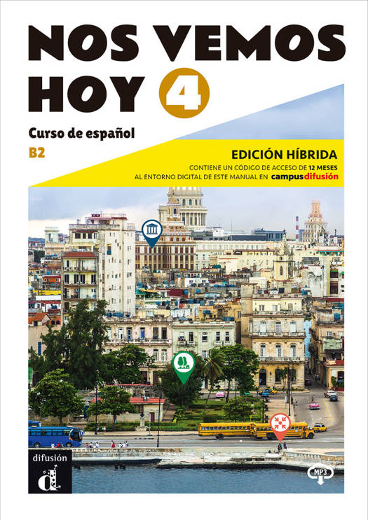 Esta edición híbrida de Nos vemos hoy 4 es la opción ideal para compaginar las ventajas del papel y de las tecnologías digitales, tanto en cursos presenciales como híbridos (blended) y a distancia.Consta del libro del alumno impreso más un código de acceso de 12 meses a Campus Difusión con el que el estudiante puede acceder, al libro y al cuaderno digitales de Nos vemos hoy 4.Asimismo, a todos los recursos propios de este manual (audios, vídeos, ejercicios autocorregibles, itinerarios digitales, etc.) y a todas las funcionalidades de comunicación, asignación de tareas, evaluación y otras de la plataforma.