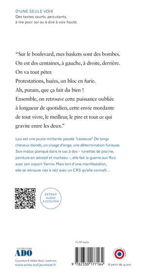 Lou est une jeune manifestante passée "casseuse". Les flics, elle leur fait la guerre, ce sont ses ennemis, des anonymes incarnant un pouvoir oppresseur honni. Mais lors d'une manifestation, elle se retrouve nez à nez avec un CRS qu'elle connaît, à savoir le voisin qu'elle croise régulièrement depuis l'enfance, et qui un jour avait soigné son genou après une chute de vélo. Elle s'interroge : qu'est-ce qui finalement justifie, légitime l'emploi de la violence ? Camp du bien versus camp du mal, est-ce aussi simple ?