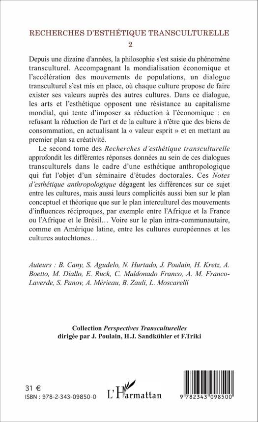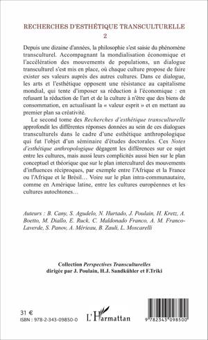 Depuis une dizaine d'années, la philosophie s'est saisie du phénomène transculturel. Accompagnant la mondialisation économique et l'accélération des mouvements de populations, un dialogue s'est mis en place, où chaque culture propose de faire exister ses valeurs auprès des autres cultures. Le second tome des Recherches d'esthétique transculturelle approfondit les différences et les complicités des mouvements d'influence réciproques, notamment entre l'Afrique et la France ou l'Afrique et le Brésil, voire sur le plan intracommunautaire, comme en Amérique latine.