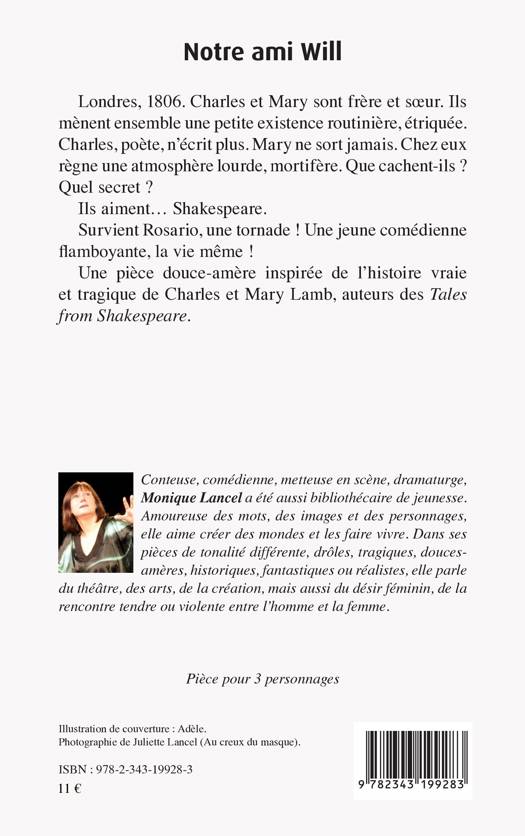 Londres, 1806. Charles et Mary sont frère et soeur. Ils mènent ensemble une petite existence routinière, étriquée. Charles, poète, n'écrit plus. Mary ne sort jamais. Chez eux règne une atmosphère lourde, mortifère. Que cachent-ils ? Quel secret ? Ils aiment...Shakespeare. Survient Rosario, une tornade ! Une jeune comédienne flamboyante, la vie même ! Une pièce douce-amère inspirée de l'histoire vraie et tragique de Charles et Mary Lamb, auteurs des Tales from Shakespeare.