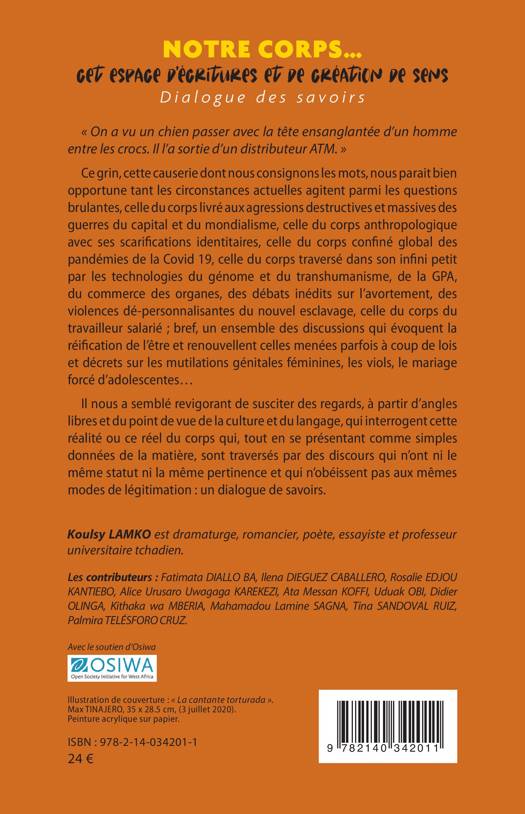 On a vu un chien passer avec la tête ensanglantée d'un homme entre les crocs. Il l'a sortie d'un distributeur ATM. Ce grin, cette causerie dont nous consignons les mots, nous parait bien opportune tant les circonstances actuelles agitent parmi les questions brulantes, celle du corps livré aux agressions destructives et massives des guerres du capital et du mondialisme, celle du corps anthropologique avec ses scarifications identitaires, celle du corps confiné global des pandémies de la Covid 19, celle du corps traversé dans son infini petit par les technologies du génome et du transhumanisme, de la GPA, du commerce des organes, des débats inédits sur l'avortement, des violences dé-personnalisantes du nouvel esclavage, celle du corps du travailleur salarié; bref, un ensemble des discussions qui évoquent la réification de l'être et renouvellent celles menées parfois à coup de lois et décrets sur les mutilations génitales féminines, les viols, le mariage forcé d'adolescentes... Il nous a semblé revigorant de susciter des regards, à partir d'angles libres et du point de vue de la culture et du langage, qui interrogent cette réalité ou ce réel du corps qui, tout en se présentant comme simples données de la matière, sont traversés par des discours qui n'ont ni le même statut ni la même pertinence et qui n'obéissent pas aux mêmes modes de légitimation: un dialogue de savoirs.