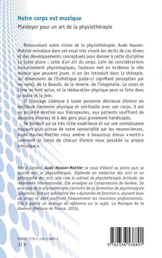 Renouvelant notre vision de la physiothérapie, Aude Hauser-Mottier entrelace dans cet essai très vivant les récits de cas très divers et des développements conceptuels pour donner à cette discipline sa juste place celle d'un art du corps. Loin de considérations exclusivement physiologiques, l'auteure met en évidence le rôle moteur que peuvent jouer, si on les introduit dans la thérapie, les dimensions de l'Esthétique (perception par les sens), de la Beauté, de la rêverie, de l'imaginaire. Le corps et l'âme ne font qu'un, et la rééducation physique peut se faire dans la grâce et la joie. Si l'ouvrage s'adresse à toute personne désireuse d'entrer en meilleure harmonie physique et spirituelle avec son corps, il est en priorité destiné aux thérapeutes, aux patients souffrant de douleurs diverses et à des gens plus gravement handicapés. Se fondant sur sa très riche expérience et une connaissance toujours plus accrue de notre sensorialité par les neurosciences, Aude Hauser-Mottier nous amène à beaucoup mieux sentir comment le corps de chacun d'entre nous possède sa propre musique .
