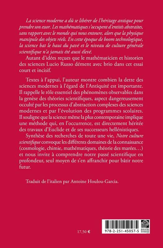 La science moderne a du se liberer de l'heritage antique pour prendre son essor. Les mathematiques s'occupent d'entites abstraites, sans rapport avec le monde qui nous entoure, alors que la physique manipule des objets reels. En cette epoque de boom technologique, la science bat le haut du pave et le niveau de culture generale scientifique n'a jamais ete aussi eleve. Autant d'idees recues que le mathematicien et historien des sciences Lucio Russo dement avec brio dans cet essai court et incisif. Textes a l'appui, l'auteur montre combien la dette des sciences modernes a l'egard de l'Antiquite est importante. Il rappelle le role essentiel des phenomenes observables dans la genese des theories scientifiques, aspect dangereusement occulte par les processus d'abstraction complexes des sciences modernes et par l'evolution des programmes scolaires. Il souligne que la science meme la plus contemporaine implique une methode qui, en l'occurrence, est directement heritee des travaux d'Euclide et de ses successeurs hellenistiques. Synthese des recherches de toute une vie, Notre culture scientifique convoque les differents domaines de la connaissance (cosmologie, chimie, mathematiques, theorie des marees...) et nous invite a comprendre notre passe scientifique en profondeur, seul moyen de s'en affranchir pour batir notre futur.