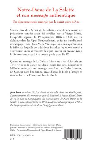 Sous le titre de « Secret de La Salette » circule une masse de prédictions censées avoir été révélées par la Vierge Marie, lorsqu'elle apparut le 19 septembre 1846 à 1 800 mètres d'altitude dans les Alpes. Paradoxalement, ce fut saint Jean-Marie Vianney, humble curé d'Ars, qui discerna la faille par laquelle ces additions inauthentiques ont réussi à s'introduire. Autre découverte faite par l'auteur de cet ouvrage : le discernement exercé à ce propos par le pape Pie IX. Quant au message de La Salette lui-même : les récits pris en 1846-47 sous la dictée des deux jeunes témoins, Maximin et Mélanie, montrent un message centré sur le Christ Sauveur, un Sauveur dont l'humanité, créée d'après la Bible à l'image et ressemblance de Dieu, a un besoin absolu.
