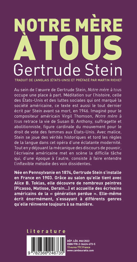 Au sein de l'oeuvre de Gertrude Stein, Notre mère à tous occupe une place à part. Méditation sur l'histoire, celle des États-Unis et des luttes sociales qui ont marqué la société américaine, ce texte est aussi le tout dernier écrit par Stein avant sa mort, en 1946. Imaginé pour le compositeur américain Virgil Thomson, Notre mère à tous retrace la vie de Susan B. Anthony, suffragette et abolitionniste, figure cardinale du mouvement pour le droit de vote des femmes aux États-Unis. Avec malice, Stein se joue des vérités historiques et tord les règles de la langue dans cet opéra d'une éclatante modernité. Tout en y déjouant la mécanique des discours de pouvoir, l'écrivaine américaine met en scène la difficile tâche qui, d'une époque à l'autre, consiste à faire entendre l'inflexible mélodie des voix dissidentes.