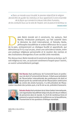 Dans Notre monde est à construire, les auteurs, Ved Nanda, hindouiste pratiquant, qui fait autorité dans le domaine du droit international, et Daisaku Ikeda, philosophe bouddhiste et ardent défenseur de la cause de la paix, entreprennent un dialogue fouillé et approfondi, qui démontre qu’il n’y a qu’un pas, sinon une coïncidence totale, entre une pratique religieuse personnelle et le soutien des normes et des institutions émergentes d’une société civile mondiale. Par-dessus tout, Notre monde est à construire donne au lecteur, qu’il soit religieux ou non, un puissant sentiment d’espoir pour l’avenir, un avenir universellement partagé.