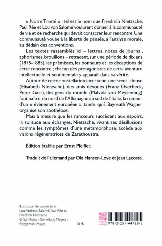 « Notre Trinité » : tel est le nom que Friedrich Nietzsche, Paul Rée et Lou von Salomé voulurent donner à la communauté de vie et de recherche qui devait consacrer leur rencontre. Une communauté vouée à la liberté de pensée, à l’analyse morale, au dédain des conventions.