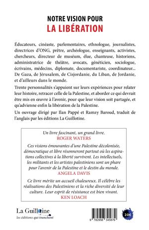 NOTRE VISION POUR LA LIBÉRATION vise à remettre en question les récits entremêlés qui ont conduit à l'impasse actuelle : le discours politique pro-israélien américain, le discours colonial israélien, le discours arabe de la prétendue normalisation et le discours défunt des factions palestiniennes. Aucun ne promeut la justice, aucun n'a apporté de solution, aucun n'est de bon augure pour l'une ou l'autre des parties concernées. Éducateurs, artistes, historiens, militants des droits humains, prisonniers politiques, scientifiques, journalistes, élus, trente personnalités s'appuient sur leurs expériences pour retracer ce qui a été fait et ce qui devrait être réalisé à l'avenir, d'une manière qui reflète non seulement les aspirations des Palestiniens, mais aussi leur vision de ce qui est possible.