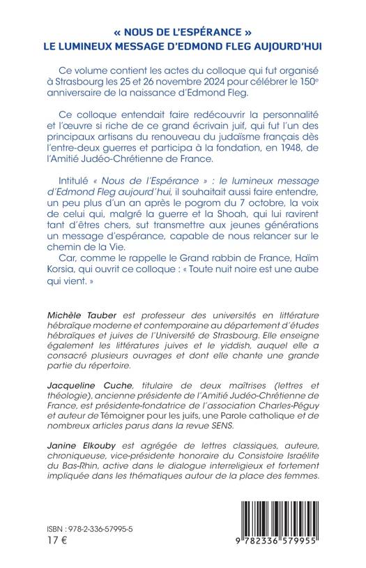 Ce volume contient les actes du colloque qui fut organisé à Strasbourg les 25 et 26 novembre 2024 pour célébrer le 150e anniversaire de la naissance d'Edmond Fleg. Ce colloque entendait faire redécouvrir la personnalité et l'oeuvre si riche de ce grand écrivain juif, qui fut l'un des principaux artisans du renouveau du judaïsme français dès l'entre-deux guerres et participa à la fondation, en 1948, de l'Amitié Judéo-Chrétienne de France. Intitulé Nous de l'Espérance: le lumineux message d'Edmond Fleg aujourd'hui, il souhaitait aussi faire entendre, un peu plus d'un an après le pogrom du 7 octobre, la voix de celui qui, malgré la guerre et la Shoah, qui lui ravirent tant d'êtres chers, sut transmettre aux jeunes générations un message d'espérance, capable de nous relancer sur le chemin de la Vie. Car, comme le rappelle le Grand rabbin de France, Haïm Korsia, qui ouvrit ce colloque: Toute nuit noire est une aube qui vient.