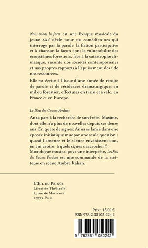 Nous étions la forêt est une fresque musicale du jeune XXIe siècle pour six comédien·nes qui interroge par la parole, la fiction participative et la chanson la façon dont la vulnérabilité des écosystèmes forestiers, face à la catastrophe climatique, raconte nos sociétés contemporaines et nos propres rapports à l’épuisement des / de nos ressources.