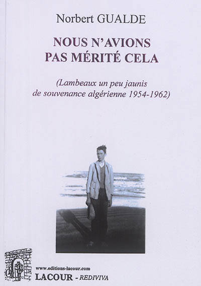 Nous n'avions pas mérité cela demeure la phrase que répètent ceux - particulièrement les Pieds-Noirs et les Harkis - qui au cours de la guerre d'Algérie payèrent de douleurs et de chagrins des faits délétères dont ils furent les victimes. La recension proposée ici rassemble quelques réminiscences datant de la guerre 1954-1962. Il s'agit des souvenirs d'un jeune pied-noir né en Algérie et l'ayant quittée, la veille de l'indépendance, à l'âge de dix-huit ans. Il est question dans l'ouvrage d'évocations d'une enfance et d'une adolescence passées à Staouéli, à cette époque un village de la côte algéroise. Le témoignage très personnel est un récit apportant un regard forcément subjectif sur une période troublée de notre pays, de ses anciens départements d'Algérie, de leurs habitants d'alors et de ceux qui dirigeaient la France.