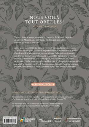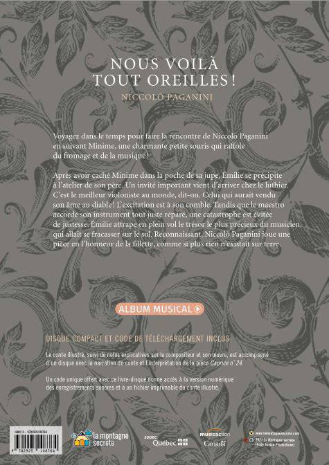 Voyagez dans le temps pour faire la rencontre de Niccolo Paganini en suivant Minime, une charmante petite souris qui raffole du fromage et de la musique ! Après avoir caché Minime dans la poche de sa jupe, Émilie se précipite à l'atelier de son père. Un invité important vient d'arriver chez le luthier. C'est le meilleur violoniste au monde, dit-on. Celui qui aurait vendu son âme au diable ! L'excitation est à son comble. Tandis que le maestro accorde son instrument tout juste réparé, une catastrophe est évitée de justesse. Émilie attrape en plein vol le trésor le plus précieux du musicien, qui allait se fracasser sur le sol. Reconnaissant, Niccolò Paganini joue une pièce en l'honneur de la fillette, comme si plus rien n'existait sur terre.