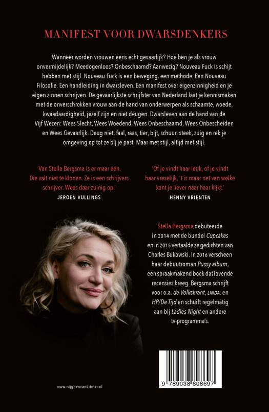Wanneer worden vrouwen eens echt gevaarlijk? Als ze ophouden met behagen. Alle strikjes van zich afgooien en Nouveau Fuck krijgen, of het zich aanmeten. Nouveau Fuck is een beweging, een levensstijl, een manier van kijken. Aan de hand van het werk van rebelse mensen uit de wereld van literatuur en kunst als Erica Young, Elizabeth Wurtzel, Mona Eltahawy, en Valerie Solanas schrijft Stella Bergsma over onderwerpen als schaamte, woede, kwaadaardigheid, jezelf zijn en wel of niet deugen. Hoe ben je als vrouw onvermijdelijk? Meedogenloos? Nouveau Fuck is een manifest over eigenzinnigheid en je eigen zinnen schrijven.