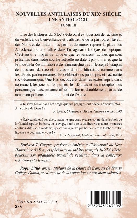 Lire des histoires du XIXe siècle où il est question de racisme et de violence, de bienveillance et d’altruisme de la part ou en faveur des Noirs et des métis nous permet de mieux repérer la place des afrodescendants antillais dans l’imaginaire français de l’époque. C’est aussi le moyen de rappeler que les tensions raciales qui sont présentes dans notre société ne datent pas d’hier et que la France de la Restauration et de la monarchie de Juillet se préoccupait de questions de race et de classe dans la littérature comme dans les débats parlementaires, les délibérations juridiques et l’actualité socioéconomique. Une fois découverts dans les textes repris dans ce recueil, les joies et les peines, les défaites et les triomphes des personnages d’ascendance africaine feront durablement partie de notre compréhension du monde et de l’Autre.
