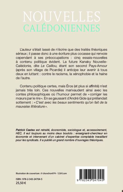 L'auteur s'était lassé de n'écrire que des traités théoriques sérieux ; il passe donc à une écriture plus cocasse qui renvoie cependant à ses préoccupations : cinq essais-nouvelles à contenu politique évident. La future Kanaky Nouvelle- Calédonie, dite Le Caillou, étant son second Pays-Amour (après son village de Picardie) il anticipe leur avenir à tous deux en luttant : contre le racisme, la xénophobie et la haine de l'autre. Contenu politique certes, mais Éros (et plus si affinité) n'est jamais très loin. Ces nouvelles marivaudent ainsi avec les contes philosophiques où l'humour permet de « corriger les moeurs par le rire ». En se gaussant d'André Gide qui prétendait sottement : « C'est avec les beaux sentiments qu'on fait de la mauvaise littérature ».