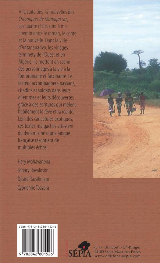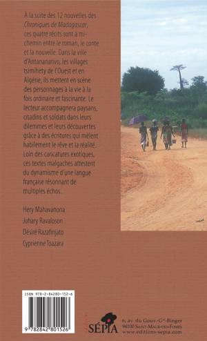 À la suite des 12 nouvelles des "Chroniques de Madagascar", ces quatre récits sont à mi-chemin entre le roman, le conte et la nouvelle. Dans la ville d'Antananarivo, les villages tsimihety de l'Ouest et en Algérie, ils mettent en scène des personnages à la vie à la fois ordinaire et fascinante. Le lecteur accompagnera paysans, citadins et soldats dans leurs dilemmes et leurs découvertes grâce à des écritures qui mêlent habilement le rêve et la réalité. Loin des caricatures exotiques, ces textes malgaches attestent du dynamisme d'une langue française résonnant de multiples échos.