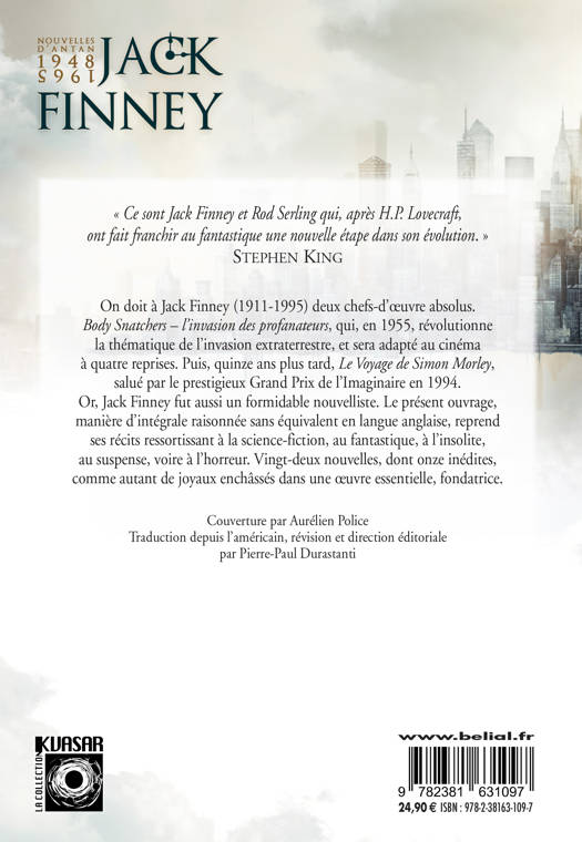 Or, Jack Finney fut aussi un formidable nouvelliste. Le présent ouvrage, manière d'intégrale raisonnée sans équivalent en langue anglaise, reprend ses récits ressortissant à la science-fiction, au fantastique, à l'insolite, au suspense, voire à l'horreur. Vingt-deux nouvelles, dont onze inédites, comme autant de joyaux enchâssés dans une oeuvre essentielle, fondatrice.