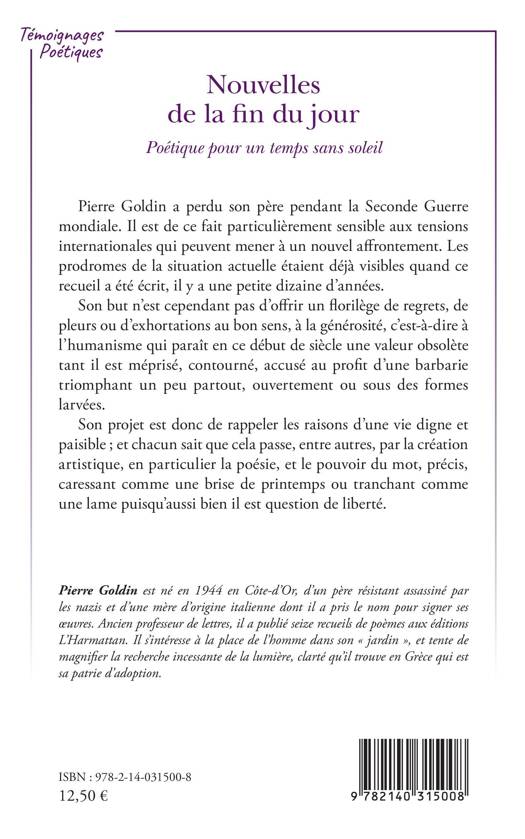 Pierre Goldin a perdu son père pendant la Seconde Guerre mondiale. Il est de ce fait particulièrement sensible aux tensions internationales qui peuvent mener à un nouvel affrontement. Les prodromes de la situation actuelle étaient déjà visibles quand ce recueil a été écrit, il y a une petite dizaine d'années. Son but n'est cependant pas d'offrir un florilège de regrets, de pleurs ou d'exhortations au bon sens, à la générosité, c'est-à-dire à l'humanisme qui paraît en ce début de siècle une valeur obsolète tant il est méprisé, contourné, accusé au profit d'une barbarie triomphant un peu partout, ouvertement ou sous des formes larvées. Son projet est donc de rappeler les raisons d'une vie digne et paisible ; et chacun sait que cela passe, entre autres, par la création artistique, en particulier la poésie, et le pouvoir du mot, précis, caressant comme une brise de printemps ou tranchant comme une lame puisqu'aussi bien il est question de liberté.