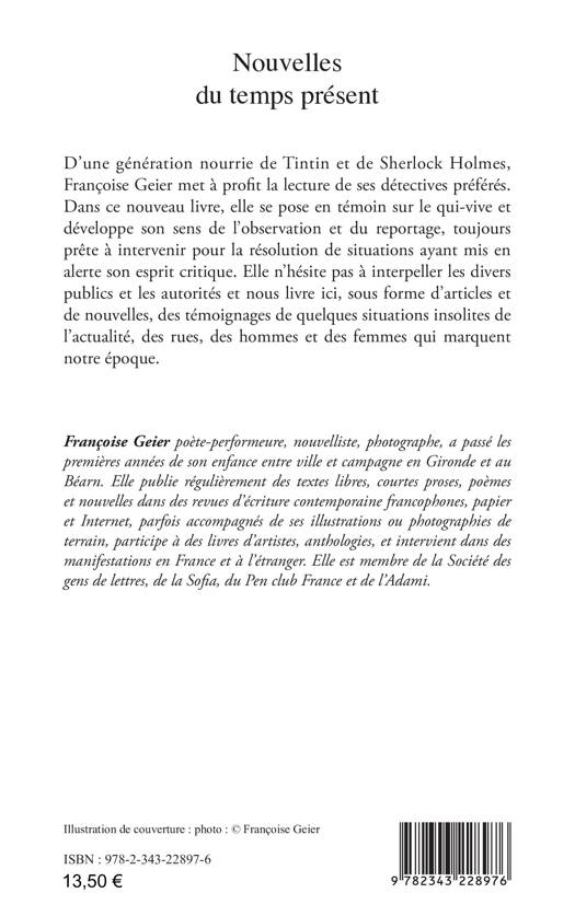 D'une génération nourrie de Tintin et de Sherlock Holmes, Françoise Geier met à profit la lecture de ses détectives préférés. Dans ce nouveau livre, elle se pose en témoin sur le qui-vive et développe son sens de l'observation et du reportage, toujours prête à intervenir pour la résolution de situations ayant mis en alerte son esprit critique. Elle n'hésite pas à interpeller les divers publics et les autorités et nous livre ici, sous forme d'articles et de nouvelles, des témoignages de quelques situations insolites de l'actualité, des rues, des hommes et des femmes qui marquent notre époque.