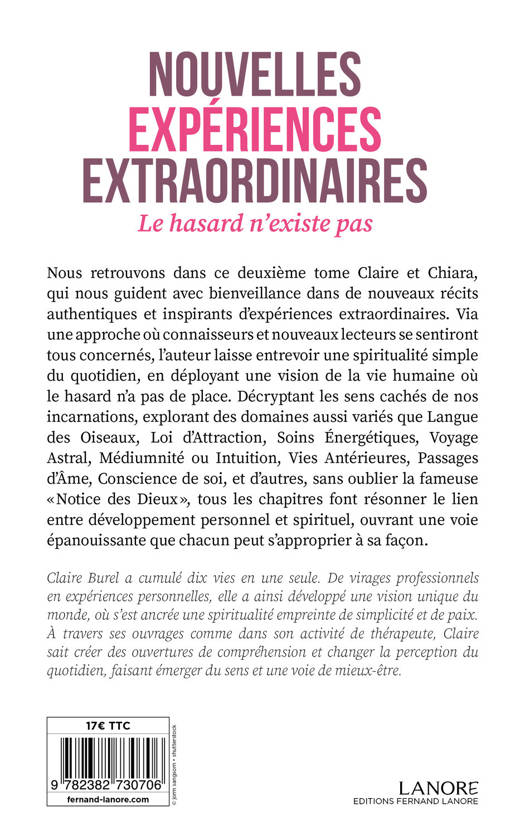 Nous retrouvons dans ce deuxième tome Claire et Chiara, qui nous guident avec bienveillance dans de nouveaux récits authentiques et inspirants d’expériences extraordinaires. Via une approche où connaisseurs et nouveaux lecteurs se sentiront tous concernés, l’auteur laisse entrevoir une spiritualité simple du quotidien, en déployant une vision de la vie humaine où le hasard n’a pas de place. Décryptant les sens cachés de nos incarnations, explorant des domaines aussi variés que Langue des Oiseaux, Loi d’Attraction, Soins Énergétiques, Voyage Astral, Médiumnité ou Intuition, Vies Antérieures, Passages d’Âme, Conscience de soi, et d’autres, sans oublier la fameuse «?Notice des Dieux?», tous les chapitres font résonner le lien entre développement personnel et spirituel, ouvrant une voie épanouissante que chacun peut s’approprier à sa façon.