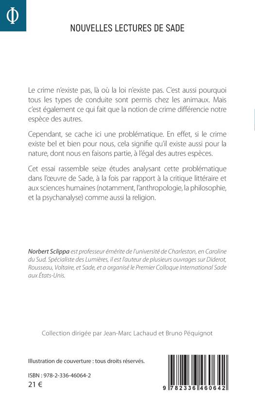 Le crime n’existe pas, là où la loi n’existe pas. C’est aussi pourquoi tous les types de conduite sont permis chez les animaux. Mais c’est également ce qui fait que la notion de crime différencie notre espèce des autres. Cependant, se cache ici une problématique. En effet, si le crime existe bel et bien pour nous, cela signifie qu’il existe aussi pour la nature, dont nous en faisons partie, à l’égal des autres espèces. Cet essai rassemble seize études analysant cette problématique dans l’œuvre de Sade, à la fois par rapport à la critique littéraire et aux sciences humaines (notamment, l’anthropologie, la philosophie, et la psychanalyse) comme aussi la religion.