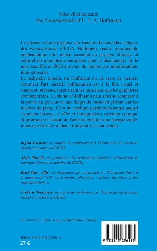 Le présent volume propose aux lecteurs de nouvelles analyses des Fantasiestücke d’E.T.A. Hoffmann, œuvre intermédiale emblématique d’un auteur essentiel au paysage littéraire et culturel du romantisme européen. La recherche actuelle sur Hoffmann n’a de cesse de montrer comment l’art narratif hoffmannien est à la fois visuel et sonore et intéresse, inspire tant les musiciens que les graphistes contemporains. C’est un medium pluridimensionnel auquel s’ajoutent l’ironie, le Witz et l’imagination suscitant comique et grotesque et faisant de l’acte de création une énergie vitale, innée que l’artiste souhaite transmettre à son lecteur.