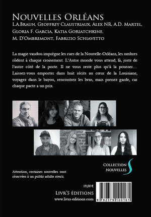 La magie vaudou imprègne les rues de la Nouvelle-Orléans, les ombres rôdent à chaque croisement. L’Autre monde vous attend, là, juste de l’autre côté de la porte. Il ne vous reste plus qu’à la pousser… Laissez-vous emporter dans huit récits au cœur de la Louisiane, voyagez dans le bayou, rencontrez les lwas, mais prenez garde, car chaque pacte a un prix.