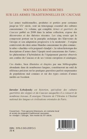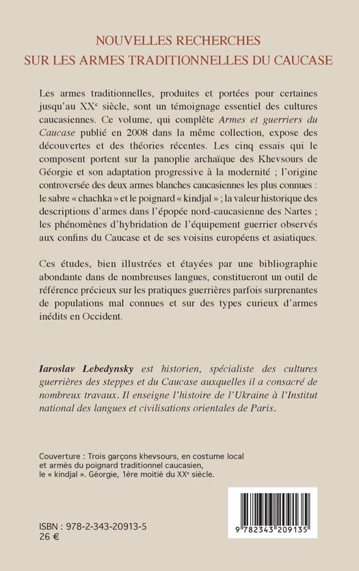 Les armes traditionnelles sont un témoignage essentiel des cultures caucasiennes. Les cinq essais qui composent l'ouvrage portent sur la panoplie archaïque des Khevsours de Géorgie et son adaptation progressive à la modernité ; l’origine controversée des deux armes blanches caucasiennes les plus connues : le sabre « chachka » et le poignard « kindjal » ; la valeur historique des descriptions d’armes dans l’épopée nord-caucasienne des Nartes ; les phénomènes d’hybridation de l’équipement guerrier observés aux confins du Caucase et de ses voisins européens et asiatiques. Des illustrations complètent cette étude, outil de référence précieux sur les pratiques guerrières parfois surprenantes de populations mal connues et sur des types curieux d’armes inédits en Occident. (voir aussi : https://www.editions-harmattan.fr/livre-armes_et_guerriers_du_caucase_les_traditions_guerrieres_des_peuples_caucasiens_iaroslav_lebedynsky-9782296058491-26244.html).