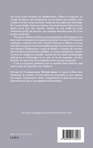 Au cours d'une tempête en Méditerranée, Éliane et François, un couple de blancs, qui naviguaient sur un bateau de croisière, sont tombés à la mer, heureusement munis de leurs gilets de sauvetage. Ils se sont réfugiés dans une maison vide dont la porte était ouverte. Après avoir pris une douche chaude, ils ont enfilé les seuls vêtements qu'ils ont trouvés, une tunique africaine pour lui, et un boubou pour elle. Peu après, Hélène et Étienne, les propriétaires de la maison, tous deux noirs, sortis dans la tempête pour porter secours à d'éventuels naufragés, rentrent chez eux. Voyant François et Éliane en tenue africaine et portant encore leurs gilets orange, ils pensent que ce sont des migrants ! Quiproquos, coups de théâtre, coupures de courant, intervention de gendarmes antillais, et d'autres péripéties, comme l'arrivée de dangereux bandits, amèneront les quatre personnages principaux à s'interroger sur le prix de la vie humaine, sur leur identité, sur leur sens de la solidarité. Bref, sur leur humanité. C'est à ces questions que la comédie Nuit blanche Nuit Noire essaie de répondre avec humour.