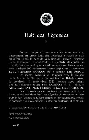 En ces temps si particuliers de crise sanitaire, l’association culturelle Nuit des Légendes a relevé le défi en offrant dans le parc de la Mairie de Pleuven (Finistère Sud), le vendredi 7 août 2020, un spectacle de contes de qualité, qui a montré que la tradition orale est bien vivante, avec quelque 300 spectateurs venus applaudir la conteuse LULU (Lucienne MOISAN) et le conteur Loïg PUJOL. De même, l’association, toujours avec le soutien de la Mairie de Pleuven, a pu maintenir sa Balade contée, le vendredi 11 septembre 2020, menée avec talent par la conteuse Marie-Thé SAINRAT et les conteurs Alain SAINRAT, Michel LIDOU et Jean-Marc DEROUEN. Ces six conteuses et conteurs ont retranscrit leurs histoires contées dans Nuit des Légendes 3, troisième volume publié par l’association, dans lequel on découvrira également le parcours qui les a amené(e)s à devenir conteuses et conteurs.