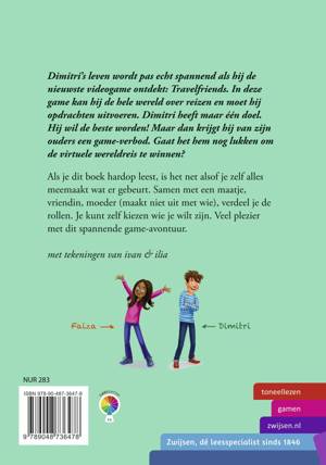 Toneelleesboek op AVI-niveau E6. Twee lezers nemen de rol van een personage op zich en lezen de teksten hardop voor. Ze voeren eigenlijk samen een toneelstukje op. Zo is lezen echt leuk! Dit boek gaat over Dimitri. Zijn leven wordt pas echt spannend als hij de nieuwste videogame ontdekt: Travelfriends. In deze game kan hij de hele wereld over reizen en moet hij opdrachten uitvoeren. Dimitri heeft maar één doel. Hij wil de beste worden! Maar dan krijgt hij van zijn ouders een game-verbod. Gaat het hem nog lukken om de virtuele wereldreis te winnen?