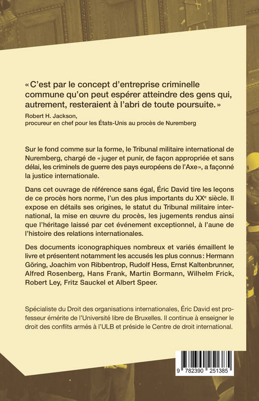 Dans cet ouvrage de référence sans égal, Éric David tire les leçons de ce procès hors norme, l'un des plus importants du XXe siècle. Il expose en détails ses origines, le statut du Tribunal militaire international, la mise en oeuvre du procès, les jugements rendus ainsi que l'héritage laissé par cet événement exceptionnel, à l'aune de l'histoire des relations internationales.