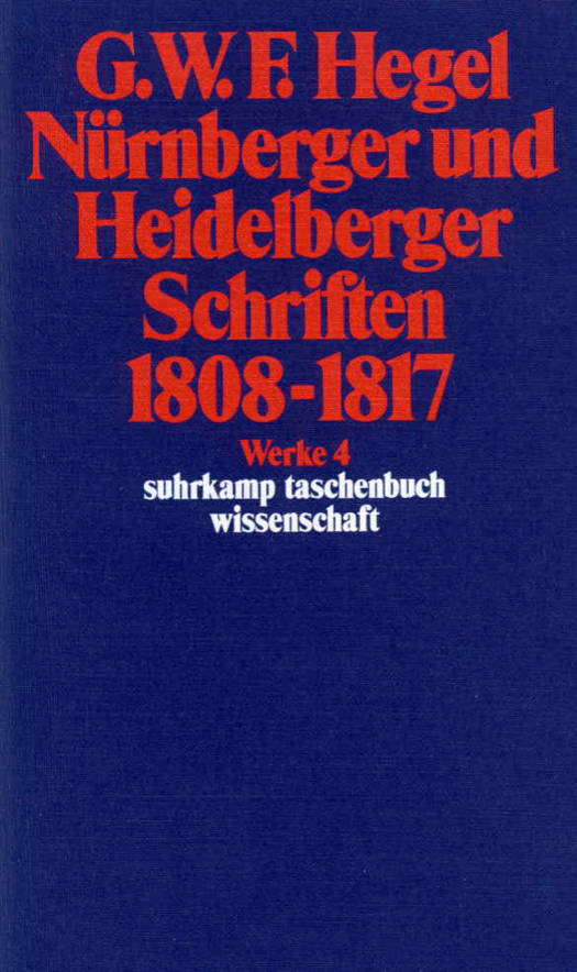 NÜRNBERGER SCHRIFTENI. Texte zur Philosophischen Propädeutik1. Philosophische Enzyklopädie für die Oberklasse (1808 ff.)2. Bewußtseinslehre für die Mittelklasse (1808/09)3. Logik für die Mittelklasse (1808/09)4. Bewußtseinslehre für die Mittelklasse (1809 ff.)5. Logik für die Unterklasse (1809/10)6. Begriffslehre für die Oberklasse (1809/10)7. Logik für die Mittelklasse (1810/11)8. Rechts-, Pflichten- und Religionslehre für die Unterklasse (1810 ff.)9. Religionslehre für die Mittel- und Oberklasse (1811-1813)10. Zwei Fragmente11. Anhang: Hegels UnterrichtsgegenständeII. Gymnasialreden1. Rede auf den Amtsvorgänger Rektor Schenk am 10. Juli 18092. Rede zum Schuljahrabschluß am 29. September 18093. Rede zum Schuljahrabschluß am 14. September 18104. Rede zum Schuljahrabschluß am 2. September 18115. Rede zum Schuljahrabschluß am 2. September 18136. Rede zum Schuljahrabschluß am 30. August 1815III. Gutachten1. Gutachten über die Stellung des Realinstituts zu den übrigen Studienanstalten (1810)2. Bericht über das Gymnasialschuljahr 1811/12 (Auszug)3. Über den Vortrag der Philosophie auf Gymnasien. Privatgutachten für Immanuel Niethammer (1812)4. Über den Vortrag der Philosophie auf Universitäten. Schreiben an Friedrich v. Raumer (1816)HEIDELBERGER SCHRIFTENZwei Aufsätze aus den Heidelbergischen Jahrbüchern der Literatur (1817)1. [Über] Friedrich Heinrich Jacobis Werke. Dritter Band2. [Beurteilung der] Verhandlungen in der Versammlung der Landstände des Königreichs Württemberg im Jahr 1815 und 1816Anmerkung der Redaktion zu Band 4