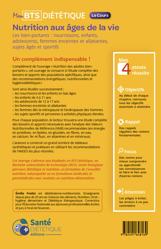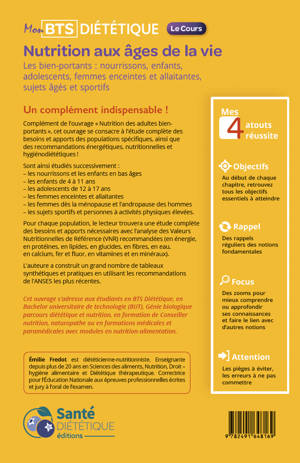 Un complément indispensable !Complément de l’ouvrage « Nutrition des adultes bien-portants », cet ouvrage se consacre à l’étude complète des besoins et apports des populations spécifiques, ainsi que des recommandations énergétiques, nutritionnelles et hygiénodiététiques !Sont ainsi étudiés successivement :– les nourrissons et les enfants en bas âges– les enfants de 4 à 11 ans– les adolescents de 12 à 17 ans– les femmes enceintes et allaitantes– les femmes dès la ménopause et l’andropause des hommes– les sujets sportifs et personnes à activités physiques élevées.Pour chaque population, le lecteur trouvera une étude complète des besoins et apports nécessaires avec l’analyse des Valeurs Nutritionnelles de Référence (VNR) recommandées (en énergie, en protéines, en lipides, en glucides, en fibres, en eau, en calcium, fer et fluor, en vitamines et en minéraux).L’auteure a construit un grand nombre de tableaux synthétiques et pratiques en utilisant les recommandations de l’ANSES les plus récentes.Cibles :Cet ouvrage s’adresse aux étudiants en BTS Diététique, en Bachelor universitaire de technologie (BUT), Génie biologique parcours diététique et nutrition, en formation de Conseiller nutrition, naturopathe ou en formations médicales et paramédicales avec modules en nutrition-alimentation.Auteur :Émilie Fredot est diététicienne-nutritionniste. Enseignante depuis plus de 20 ans en Sciences des aliments, Nutrition, Droit – hygiène alimentaire et Diététique thérapeutique. Correctrice pour l’Éducation Nationale aux épreuves professionnelles écrites et jury à l’oral de l’examen.